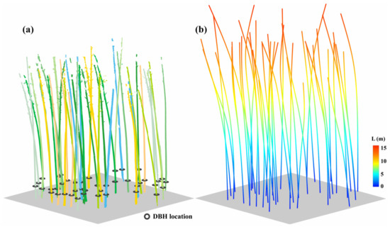 (a) Segmented culm points and extracted DBHs of individual Moso bamboos; (b) constructed bamboo culm axes using cubic B-spline curves.