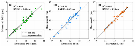Accuracy assessment of extracted structural parameters of individual Moso bamboos: (a) DBH; (b) H; (c) L.