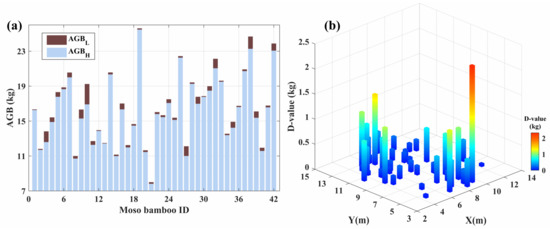 The AGBs of individual Moso bamboos in the study site were estimated based on their Hs and Ls using Equation (11) and Equation (12), respectively. According to the statistics in Table 3, the s ranged from 7.82 kg to 25.48 kg, with a mean value of 16.12 kg, and the s from 8.01 kg to 25.62 kg, with a mean value of 16.58 kg. The and of each Moso bamboo were shown in the same column in Figure 10a, and it could be seen that the was generally less than the corresponding . As indicated in Figure 10b, the difference between the individual and ranged from 0.06 kg to 2.33 kg, which was principally determined by the specific bending degree of the bamboo culm. Compared with the , the had an underestimation of about 0.46 kg per bamboo, which accounted for approximately 2.85% of the mean . As a result, the total AGBs of the Moso bamboos in the sample plot were estimated as 680.40 kg and 696.36 kg, based on H and L, respectively.