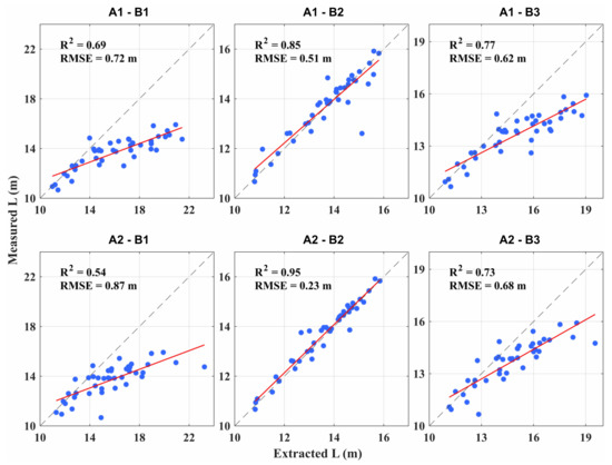 Therefore, there were six different combinations between the methods of extracting the cross-section centers, and constructing the culm axes. As indicated in Figure 12, the accuracies of the extracted bamboo lengths by various combinations were separately assessed. The best accuracy was achieved by the combination of A2-B2, with the highest R2 of 0.95 and the lowest RMSE of 0.23 m. This was the method combination adopted for the bamboo length extraction in our study. A2 showed higher performance only when combined with B2. However, the best performance of B2 was probably determined by the 3D spatial distribution characteristics of the extracted cross-section center points. All of the extracted culm centers of a single bamboo did not lie exactly on a smooth longitudinal axis, but were randomly distributed around it. If all cross-section center points were involved in the construction of the bamboo culm axis, the errors would be accumulated. Accordingly, the accuracies of the extracted culm lengths by the combinations, including B1 or B3, would be seriously reduced.