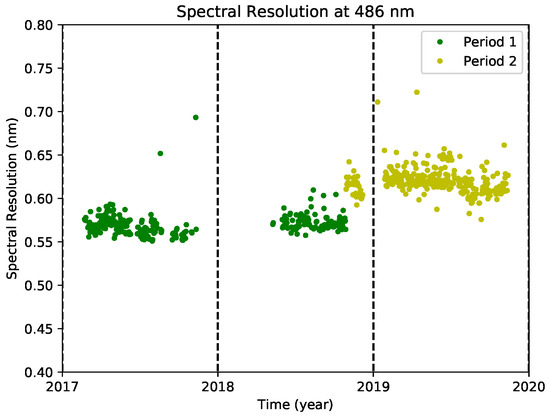 The instrument’s spectral resolution in the spectral window centered at 486 nm and for all the measurements periods. Each color identifies a period characterized by a time-constant spectral resolution.