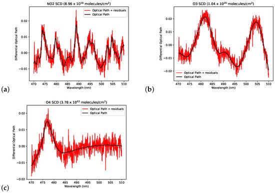 An example of the differential optical paths, due to the NO, O and O absorption, fitted by QDOAS, is reported in Figure 4. In this case, the NO, O and O spectral signatures are well defined compared to the fit residuals because the path crossed by the radiation in the analyzed spectrum (measured at a high solar zenith angle) is much longer than the one relative to the reference spectrum (measured with a low solar zenith angle; see Table 1).