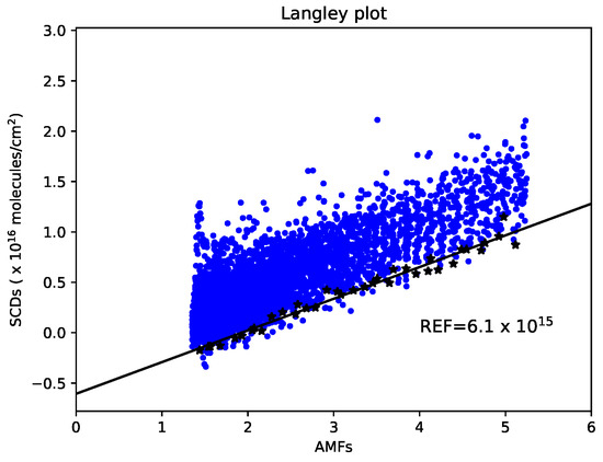 Langley plot used to estimate the contribution of the reference spectrum acquired at 11 July 2019 to the NO SCDs. Blue dots are all the NO SCDs relative to March 2019. Black stars are the low SCDs, fitted by the black line, which were used to estimate the intercept.