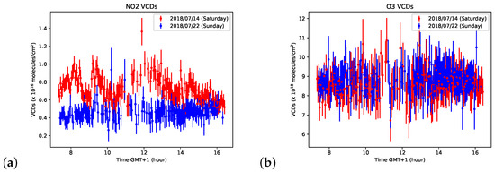 Although, as mentioned in Section 2.3.6, the NO and O diurnal trends are affected by important systematic errors, Figure 7a clearly shows that significant day-to-day differences in the NO VCDs exist. In particular, it is evident how the NO VCDs were higher and less constant on 14 July 2018 (Saturday) with respect to 22 July 2018 (Sunday), when the traffic was generally lower. This result highlights the clear presence of the tropospheric contribution to the retrieved NO VCDs. On the other hand, the O VCDs retrieved in the same two days were not affected by any significant difference (Figure 7b), suggesting that the O VCDs are less sensitive to the tropospheric variability. These first considerations are further demonstrated in Section 3.2 and Section 3.3.
