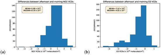 Histogram of the differences computed as NO (a) and O (b) VCDs in the afternoon minus the VCDs in the morning. For each day, VCDs representative of morning and afternoon were computed as the mean VCDs in the SZA range between 60° and 90°.