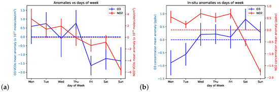 Mean anomalies of NO2 and O3 VCDs (a) and in situ concentrations (b) in each day of the week. The error bars are standard deviations of the means. The dashed lines represent the conditions with a null anomaly.