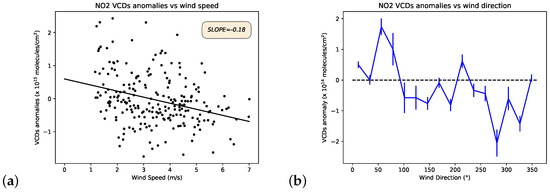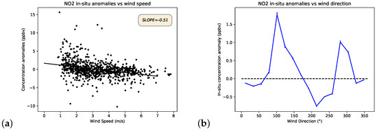 As in Section 3.2, the same analysis was also performed with NO in situ data. Figure 11a shows that the NO in situ concentrations anomalies decreased with the wind speed, with a slope of −0.51 ppbv s m. This result is in agreement with the one obtained for the NO VCDs, even though the slopes are quite different. We must take into account, indeed, that these two quantities are hardly comparable.