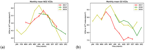 Monthly variability of NO VCDs (a) and O VCDs (b) in the three analyzed years. The error bars represent the standard deviations of the monthly mean values.