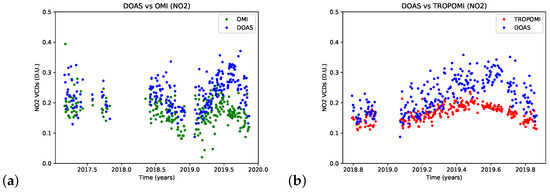 Figure 13 reports the mean NO VCDs, computed in a 3-h time bin around the satellite overpass time, measured by GASCOD/NG4 (blue dots), and the corresponding OMI (green line in the panel (a)) and TROPOMI (red line in the panel (b)) NO VCDs averaged within the 20 km radius. We can observe overall good agreement, both in the absolute values and in the ability to capture the seasonality. The same averaged NO VCDs are used in the scatterplots of Figure 14.