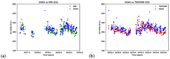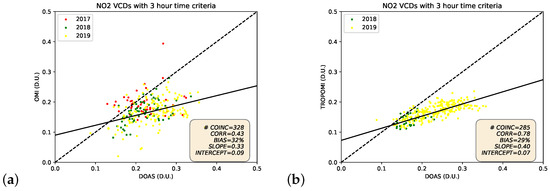 Scatterplot of O VCDs measured by GASCOD/NG4 versus OMI (a) and TROPOMI (b). DOAS data were averaged within the 3-h time bin and are compared with the mean satellite VCDs in the same time bin and within a radius of 20 km from the ECO observatory.