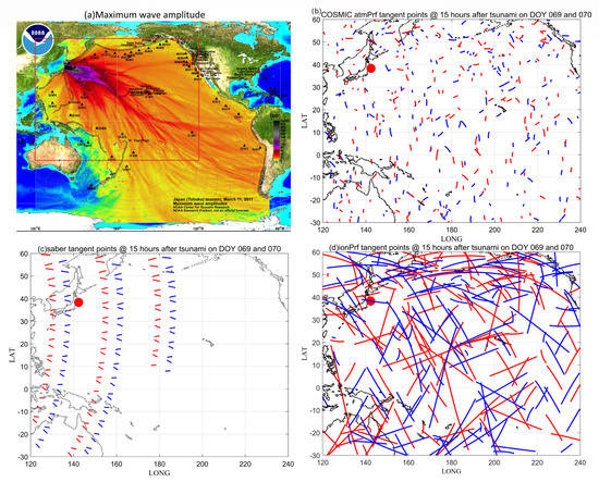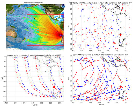 Data sources of the 16-09-2015 Chile tsunami. (a) Maximum wave amplitude with travel-time contours of the tsunami. Filled colors show the maximum computed tsunami amplitude in cm during 24 h of wave propagation (https://nctr.pmel.noaa.gov/chile20150916/ (accessed on 1 July 2022)). The red rectangular box marks the main focus area of this study. (b–d) The projections of the tangent points 15 h after the tsunami for the F3/C atmPrf, SABER, and F3/C ionPrf datasets, respectively. Blue and red curves mark the ground track of the tangent point location on DOY 259 and 260 of 2015, respectively. The thick red point shows the epicenter.