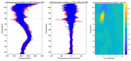 (a) Temperature profiles detected by the F3/C atmPrf datasets on DOY 259 (blue) and 260 (red) of 2015. (b) The corresponding temperature perturbation profiles. (c) The corresponding wavelet power spectrum differences between DOY 259 and 260 of 2015.