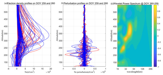(a) Electron density profiles detected by the F3/C ionPrf datasets on DOY 259 (blue) and 260 (red) of 2015. (b) The corresponding electron density perturbation profiles. (c) The corresponding wavelet power spectrum differences between DOY 259 and 260 of 2015.