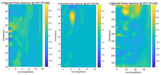 The wavelet power spectrum differences between DOY 69 and 70 of 2011 of (a) temperature profiles detected by the F3/C atmPrf datasets, (b) temperature profiles detected by the SABER datasets, and (c) electron density profiles detected by the F3/C ionPrf datasets.