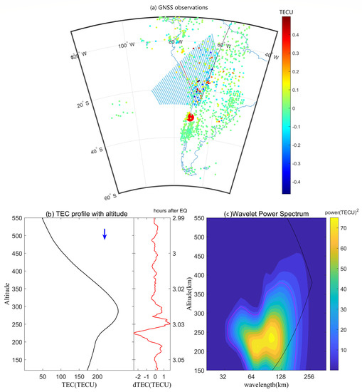 (a) Ground-based GNSS dTEC map at 01:54 UT, 17−09−2015. The TEC data is provided by SIMuRG (https://simurg.iszf.irk.ru/ (accessed on 22 October 2022)) [49]. The pale blue area marks the contributing observation area of an RO podTec profile, which is used to track the wavefront after the 2015-09-16 earthquake/tsunami. Red curves represent the projections of the tangent points for the podTec profile. (b) The TEC profile in (a) with height probed by the F3/C. The blue arrow indicates a descending or ascending scan. The red curve shows the detrended TEC using a Savitzky–Golay filter. The Y-axis scale on the right panel indicates the hours after the tsunami. (c) The corresponding WPS. The magenta contour is at the 95% confidence level. The regions outside the black curve are the “cone of influence”, where edge effects become important.