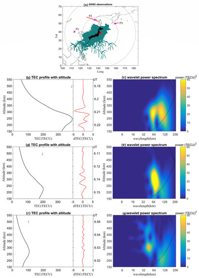 Similarly, for comparison, we also tracked the gravity wavefront signals after the 2011 tsunami. Figure 8a shows the data spatial distribution and the legends in the figure are similar to those in Figure 7. The identified perturbations are shown in Figure 8b–g in the same way as Figure 7b,c. Remarkable ionospheric vertical perturbations with scales from tens to 100 km can be observed from all three TEC profiles. Combining with the travel-time diagram of ionospheric TEC perturbations as a function of distance from the epicenter and time derived from ground-based GNSS observations (see supplementary materials), we consider that the profile P3 is attributed to the gravity wavefront with an estimated speed of ~240 m/s, while the profiles P1 and P2 are regarded as the infrasound waves coupled by seismic Rayleigh waves with the atmosphere with estimated speed ~3.0 km/s.