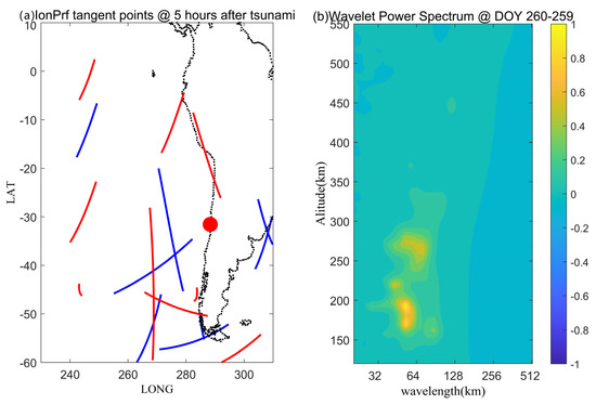 (a) The projections of the tangent points 5 h after the tsunami for the F3/C ionPrf dataset. Blue and red lines mark the ground track of the tangent point location on DOY 259 and 260 of 2015, respectively. The thick red point shows the epicenter. (b) The corresponding wavelet power spectrum differences between DOY 259 and 260 of 2015.