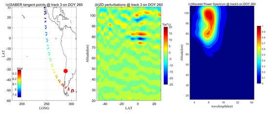 (a) The projection of the tangent points of track 3 on DOY 260 of 2015. The color denotes the observation time. (b) SABER temperature perturbations that are made by a 2−D cubic interpolation in altitude and latitude over the coherent variations of limb scans of track 3. (c) The corresponding wavelet power spectrum of track 3.