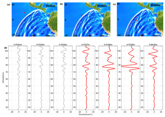 (a–c) The tsunami waves (http://nctr.pmel.noaa.gov/chile20150916/ (accessed on 1 July 2022)) at three adjacent moments (7h56m, 7h58m, and 8h00m), the red arrows represent the four observations (7h57m, 7h58m, 7h59m, and 8h00m) of SABER closest to the above three moments. (d) Panels from left to right record the temperature perturbations at seven different moments, respectively.