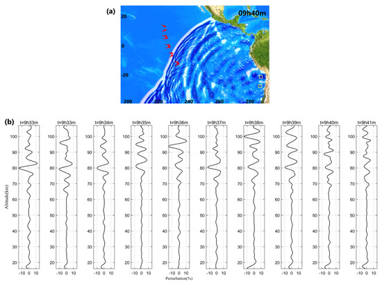 Similarly, the differences in the arrival times of perturbations recorded by track 4 and tsunami wavefronts are shown in Figure 13. Figure 13a displays the tsunami waves (http://nctr.pmel.noaa.gov/chile20150916/ (accessed on 1 July 2022)) at 09h40m, while the red arrows represent the projections of the tangent point of ten observations by SABER around the above moment. The panels from left to right in Figure 13b correspond to the temperature perturbations of the ten observations from top to bottom in Figure 13a. It can be seen that these ten observations all recorded perturbations with varying amplitudes (absolute values in the range of ~5–15%) between 70–100 km height. However, the perturbations recorded in the first eight observations from top to bottom in Figure 13a all arrived earlier than the tsunami wavefront.