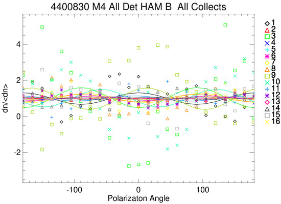 VIIRS response during dark testing with Fourier fits for Band M4 HAM B all detectors showing that there is very little correlation between the signal (points) and the 2-phipolarization model.