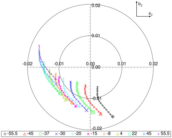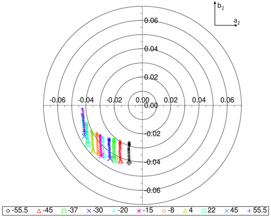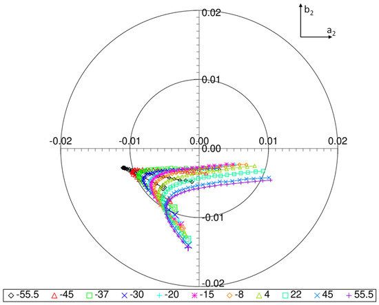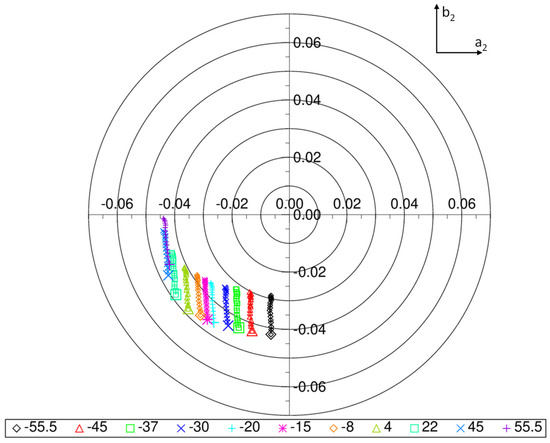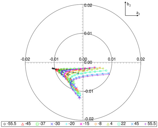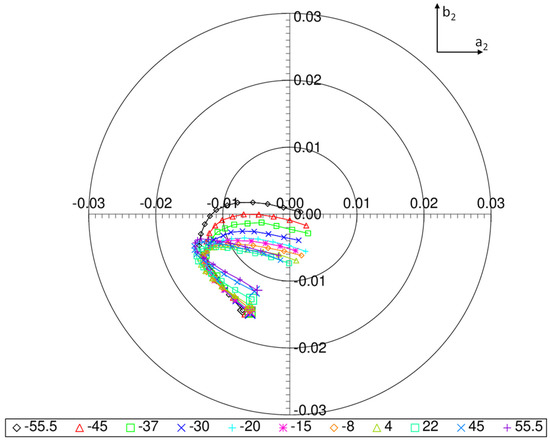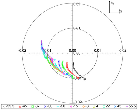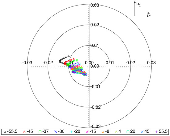 Polar plots of the polarization sensitivity determined during the PST are shown in this section. The x- and y-axis in the polar plots correspond to the a2 and b2 terms from Equation (2), respectively. From the origin of the polar plot, a vector can be used to evaluate the polarization amplitude (magnitude of this vector) and phase (half of the angle of the vector with respect to the positive x-axis). There are multiple colors on the polar plot that correspond to each unique scan angle. There are 16- or 32-line connected symbols within each color corresponding to each detector of the band of interest. Detector 1 (in instrument order) has a larger symbol to identify the detector order of the points on a connected line. Visualizing the polarization sensitivity in polar plot fashion allows for amplitude, phase, and scan angle variations to be more easily compared and patterns in their behavior to be examined.