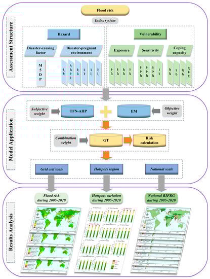After collating sufficient theoretical knowledge related to flooding, the relevant flowchart was built (Figure 2). Firstly, the basic data were collected and an index system based on the hazard–vulnerability framework was generated. Then, the index weighting method to be used in this study was determined, i.e., the game theory weighting method (a combination of the TFN-AHP and the EM method) was chosen. Finally, based on the regional integrated flood risk grade (RIFRG) model, the global flood risk assessment and spatiotemporal difference patterns were conducted from multiple perspectives and scales.