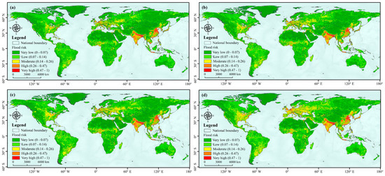 Spatial distribution of global flood risk on a grid scale in (a) 2005, (b) 2010, (c) 2015, and (d) 2020.