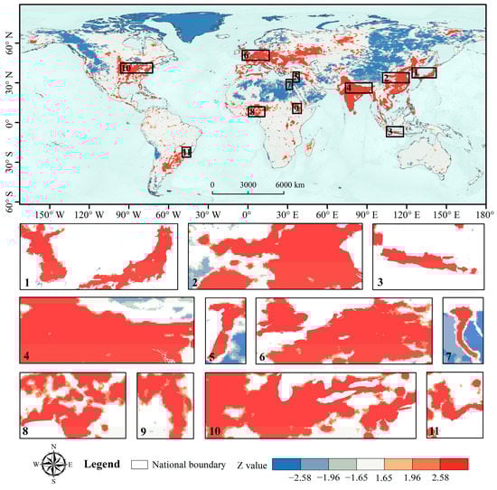 In this study, on the basis of the global flood risk assessment results on the grid scale, 11 global risk hotspot regions were identified using the hotspot analysis tool of ArcGIS. Assuming that each grid had one element, the condition for this grid to be a hotspot was that it had a high value itself and was surrounded by other elements that also had a high value [58]. In other words, for a statistically significant z-score, the higher the z-score was, the tighter the clustering of high values (hotspots) was. In this study, taking the distribution map of risk hotspot regions in 2005 as an example (Figure 5), there were 11 risk hotspot regions in the world, namely, (1) Japan Sea coast, (2) North China Plain, (3) the Jakarta region in Indonesia, (4) Ganges River Basin, (5) Eastern Mediterranean countries, (6) both sides of the English Channel, (7) Nile River Basin in Egypt, (8) countries around the Gulf of Guinea, (9) Ethiopia region, (10) Mid-Atlantic–Great Lakes region in the United States, and (11) the Rio de Janeiro region in Brazil.