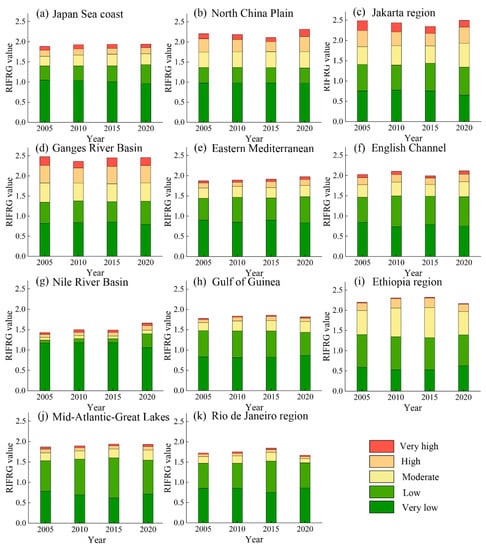 In relative terms, the countries around the Gulf of Guinea (Figure 6h), the Ethiopian region (Figure 6i), and the Rio de Janeiro region in Brazil (Figure 6k), all showed varying degrees of increasing and then decreasing flood risk. In particular, the Ethiopian region had the highest increase in risk among these three hotspot regions. Throughout history, floods have been among the most prominent disasters in Africa. However, few studies have been conducted in recent years on the flood risk in Ethiopia [62]. Additionally, the RIFRG values of the hotspots in the Jakarta region in Indonesia (Figure 6c) and Ganges River Basin (Figure 6d) were the highest among the 11 hotspots, which meant that these two hotspots were at higher flood risk. Meanwhile, the distribution of the different levels of flood risk in these two hotspots was also even, with the other hotspots being mainly dominated by areas at very low risk (i.e., the Japan Sea coast, Eastern Mediterranean countries, and Nile River Basin in Egypt) (Figure 6).