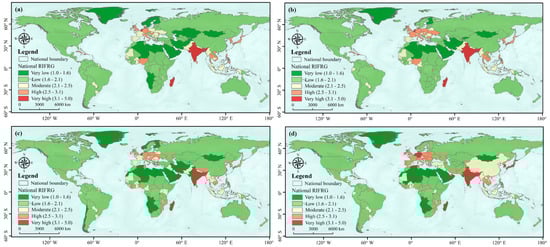 Table 8 indicates the RIFRG values for the six global continents (except Antarctica), showing that, although there was a risk reduction in some years for individual continents, the global flood risk still showed an increasing trend. The statistical results of the global flood risk by continent showed that the continent at the highest global risk was Asia, with RIFRG values of 1.989, 2.027, 2.072, and 2.181 for 2005, 2010, 2015, and 2020, respectively. In relative terms, the flood risk in Asia increased, which meant that Asia is expected to be one of the continents most prone to and most affected by floods in the future. Compared to Asia, North America was the continent at the lowest risk (with RIFRG values of 1.717, 1.735, 1.760, and 1.837 for 2005, 2010, 2015, and 2020, respectively). Meanwhile, Europe was the continent with the second lowest flood risk, in the sense that the flood prevention infrastructure could be strengthened through a booming economy and advanced technology, greatly improving human response to floods and thus reducing human casualties and economic losses due to floods [31]. Among these six continents, Africa was at low risk due to its low flood hazard [67], with the most significant reduction in risk from 2010 to 2015 (RIFRG reduction of 0.051, Table 8).