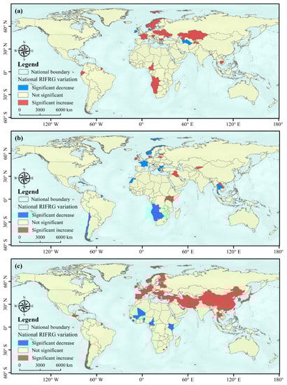 Spatial variations in the national RIFRGs across three time periods: (a) 2005–2010, (b) 2010–2015, and (c) 2015–2020.