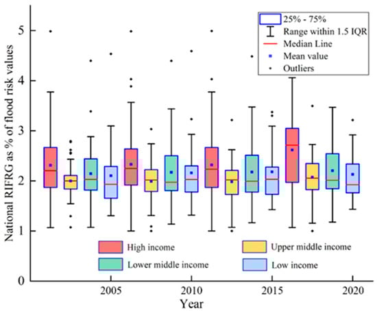 From the above elaboration, there were significant differences among countries affected by floods at the global level. Therefore, we investigated the relationship between RIFRG values and national income levels for each country from 2005 to 2020. According to the World Bank classification, countries are classified into four income levels: low income, lower-middle income, upper-middle income, and high income. The results presented in Figure 9 showed two trends in global flood risk on the national scale. Firstly, these results indicated that overall flood risk increased for all the countries in the world between 2005 and 2020, with the most pronounced increase in the period of 2015–2020 in particular. Secondly, a country’s flood risk was positively correlated with the country’s income level; in short, the flood risk of high-income countries was much higher than that of low-income countries, and the gap between the two tended to increase over time. Meanwhile, some studies suggest that globally, absolute damage from flooding could increase 20-fold by 2100 if no action is taken [57]. Thus, regardless of the income level, more efforts should be invested in future flood prevention and management, especially in high-income countries.