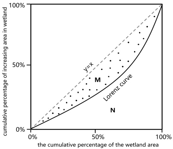 The Lorenz curve was first used to compare and analyze the equality of income distribution [31,32]. It has been widely used to analyze the spatial distributions of land cover and the equality of spatial changes [33,34,35]. This study used the Lorenz curve to assess the equality of wetland changes at a global scale. To generate the Lorenz curve, the change rates of countries were sorted in ascending order, and then the cumulative percentages of the original and change areas were calculated and represented by the x- and y-axes. The Lorenz curve formed is as illustrated in Figure 1; the closer the curve is to y = x, the smaller the curvature, indicating that the change is more equal.