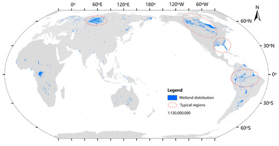 In this subsection, an analysis of the distributions and changes in wetlands from 2000 to 2020 at global, continental, and regional-with-significant-changes scales is presented. According to the statistical results obtained using GL30 data, the total global wetland area was approximately 3.44 million km2 in the year 2000. As shown in Figure 2, most wetlands were distributed in the middle-high latitudes of the northern hemisphere and the middle-low latitudes of the southern hemisphere. Some typical regions with larger areas of wetlands (depicted by red elliptical circles in Figure 2) included: (1) the Amazon River Basin region, and in this region, there is the world’s largest wetland, that is, the Pantanal [38]; (2) the West Siberian lowlands of Russia; (3) the Canadian provinces of Manitoba and Ontario near Hudson Bay; (4) the region of America near Florida. Some distribution characteristics were reported by related analysis work. For instance, Zedler and Kercher [3] found that Florida, the West Siberian lowlands, the Amazon River, and the Hudson Bay lowlands have larger wetland areas; Hu et al. [11] found similar wetland spatial distribution characteristics in the latitude direction; Mitsch and Hernandez [28] indicated that the greatest Canadian wetlands were in the provinces of Manitoba and Ontario.