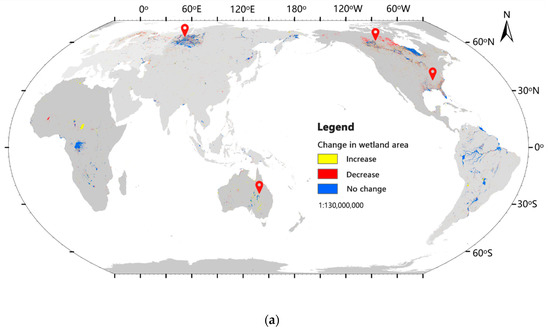 As shown in Figure 11, the area decreases mainly occurred in the countries in North America, some countries in Europe and Africa, and several countries in Asia. The three countries with the highest decreases in the global wetland area were Canada, Mali, and Finland, and they had 96% of the total decrease in global wetland area. The decrease in wetlands in Canada has also been reported by Mitsch and Hernandez (2013) [28]. Approximately 60% of the world’s countries had an increase in wetland areas, and the three countries with the highest increases in wetland area were Australia, Chad, and Russia, with 56% of the increase in global wetland area. According to related studies, Chad and Russia have a large area of wetlands under the Ramsar Convention’s protection [46], and the area of wetlands in these two countries has increased [47,48].
