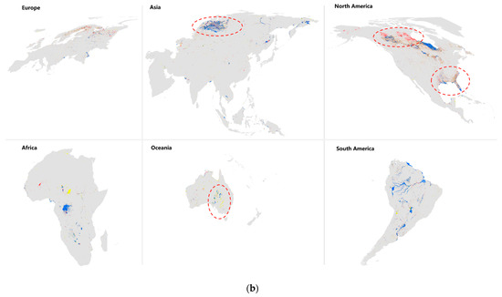 From 2000 to 2020, global wetlands experienced a total net increase of approximately 126,400 km2. The continents with a net increase in wetland areas were Oceania, Africa, Asia, and South America. Among them, Oceania had the highest increase rate (87%) and a net increase in wetland area (86,400 km2). North America had the highest rate of decrease (11%) and net area decrease (−124,000 km2). As the area change of global wetlands from 2010 to 2020 (102,400 km2) was much greater than that from 2000 to 2010 (+24,000 km2), the changes occurred mainly in the period from 2010 to 2020. Some research work for some local regions also found that the change in wetlands was not significant from 2000 to 2010, for example, the Harike wetland in India [40] and wetlands in China [41]. As illustrated in Figure 3, from 2000 to 2020, there were several regions with significant changes in wetlands and their locations are depicted by red labels in Figure 3a and red elliptical circles in Figure 3b: (1) the northern Eurasian; in this region, the wetland changes in central and northern West Siberia were considerably significant [39]; (2) the region of Canada near the Hudson Bay; (3) the region near the Gulf Coast of southern United States; (4) the central plains of Oceania.