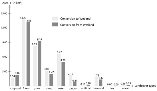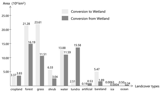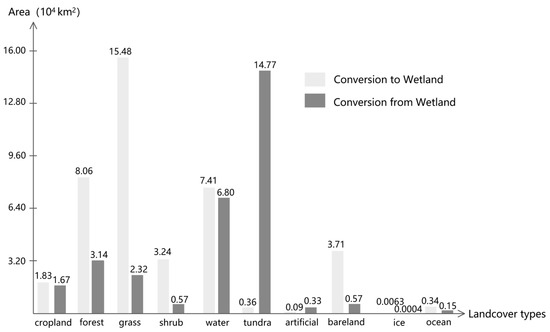 - According to Figure 6, from 2000 to 2010, the conversion from water and tundra led to a net increase in wetlands, the conversion of wetland-to-grass led to a net decrease in wetlands, and the conversions between wetland and other land cover types were almost balanced. According to Figure 7, from 2010 to 2020, the conversion from forest, grass, shrub, and bare land led to a net increase in wetlands; the conversion of wetland-to-tundra led to a net decrease in wetlands; conversions between wetland and other land cover types were almost balanced.