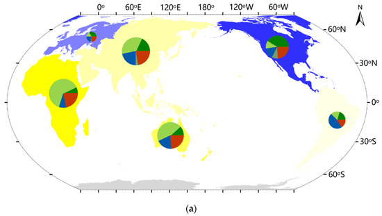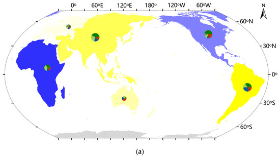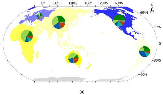 The maps in Figure 5a,b show the spatial distribution of the increase and decrease in wetland area of the conversions with other land types from 2000 to 2020, respectively. As illustrated in Figure 5a,b, the wetland conversions with other land cover types had an uneven spatial distribution. Specifically, forest-to-wetland and grassland-to-wetland conversions were mainly in Asia (30°N–65°N, 60°E–90°E) and South America (20°S–10°N, 30°W–80°W) in the tropical climate zone, resulting in an increase in global wetland areas. The wetland-tundra conversions were mainly in the continental subarctic climate zone near Hudson Bay, Canada in North America (55°N–65°N, 60°W–120°W), which resulted in a considerable decrease in North America. The conversion between wetlands and water was almost balanced, but the spatial distribution of the conversion was not homogenous, and the wetland-to-water converted area was more than that of the water-to-wetland in North America and the opposite of that in Oceania. Detailed information on the prominent land cover types in the conversion to wetlands is as follows: