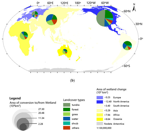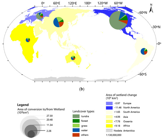 - As illustrated in Figure 9b, the conversion areas of wetland-to-tundra in North America and Europe were much larger, which may be due to the melting of permafrost according to the analysis work of Mitsch and Hernandez (2013) [28].