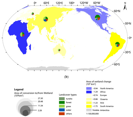 - As illustrated in Figure 9, North America and Europe had net decreases in wetland areas, whereas other continents had net increases in wetland areas from 2010 to 2020. By comparing Figure 9a with Figure 9b, it can be found that except South America, there were larger differences for the main types of land covers converted with wetland and the amounts of the conversions to/from wetland in other continents during the period.