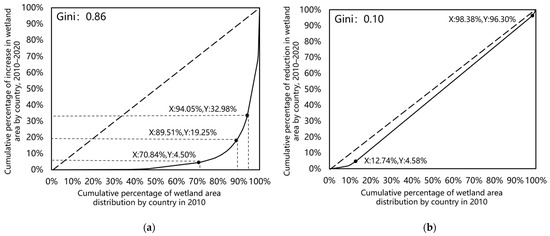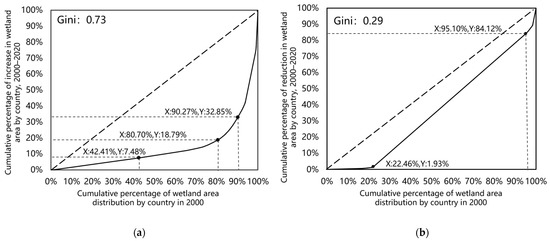 Figure 10a,b show two Lorenz curves for increases and decreases in the wetland area from 2000 to 2020, respectively. In Figure 10a, the Lorenz curve has a high curvature, and the Gini coefficient is 0.73 (>0.5 indicates a significant inequality). This indicates that the increase in global wetland area was very uneven; approximately 10% of the countries had more than 70% of the increase in global wetland area. Comparatively, the Lorenz curve of the decreases in wetland area in Figure 10b has a small curvature and the Gini coefficient is 0.29 (0.2–0.3 indicates a relative equality), which indicates that the decrease in global wetland area was nearly even.