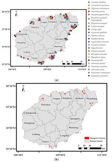 Ground survey data in 2020. (a) Distribution of dominant mangrove forest tree species in the Hainan Island. (b) Distribution range of mangrove forests in the Hainan Island.