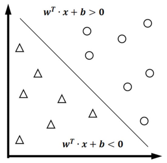 The SVM machine-learning algorithm used here for supervised classification is based on the statistical learning theory and was originally developed to solve dichotomous classification problems [21]. SVM tries to identify the optimal thresholds that maximize the separation or bounds between the support vectors [31]. In another way, this requires finding the best hyperplane in a multidimensional space that splits two sets of vectors so that the vectors closest to the hyperplane (i.e., the support vectors) are as far away as possible from the hyperplane (Figure 2). Assuming that the Euclidean distance of the vector to the hyperplane is , the minimum value of is required to represent the shortest distance of this vector to the hyperplane. Accordingly, the mathematical expressions for the hyperplane g(x) and are defined by Equations (1) and (2):