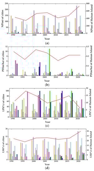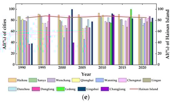 Landscape pattern index of mangrove forests in the Hainan Island during 1991–2021. (a) NP (m) index; (b) PD (m/ha) index; (c) LPI (%) index; (d) LSI (%) index; (e) AI (%) index.