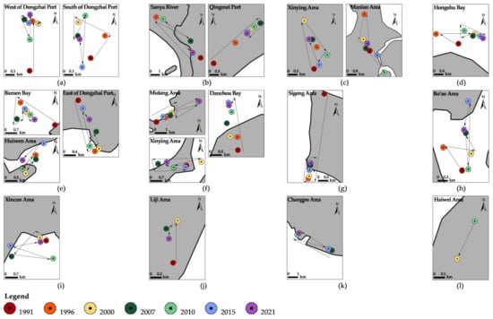 The spatial distribution of the surface cover area of the mangrove forest crown in the 12 cities and counties along the coast of the Hainan Island was used to investigate the path of mass center offsets across the six periods. From 1991 to 2021, most centers of the mangrove forest mass in the Hainan Island showed a trend of coastal movement toward the ocean or inlets, the distance of movement in the first stage being the largest (Figure 9). Specifically, the mass center of Changjiang Li Autonomous County moved in a unidirectional line, as mangrove forests were only positively identified in two of the analysis years; moreover, the mass centers of the mangrove forests in Sanya, Danzhou, and Wanning cities also moved unidirectionally until 2021, when they showed a folded-back trend. The movement trajectories in all the remaining locations appeared circular or crossed and overlapped, indicating the factors influencing mangrove forest survival.