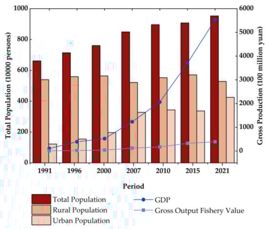 This study was taken from the WorldClim data website (https://www.worldclim.org/data/index.html, accessed on 9 September 2022) where a spatial resolution of 2.5 m of monthly weather data over 1990–2018 years of history was downloaded. Then, the CNRM-CM6-1 model and the sustainable development scenario (SSP226) were selected in CMIP6 to download the monthly climate data with a spatial resolution of 2.5 m. The average minimum temperature (°C), average maximum temperature (°C), and total precipitation (mm) in 1991, 1996, 2000, 2007, 2010, 2015, and 2021 were sorted out in the TIFF format climate data set. Furthermore, the total population, urban population, rural population, GDP, and gross output fishery value were obtained from the Annual Statistical Report of Hainan Province in 1991, 1996, 2000, 2007, 2010, 2015, and 2021, respectively.