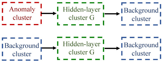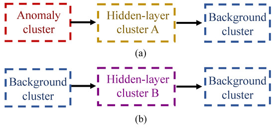 In hyperspectral anomaly detection, the anomaly and background belong to anomaly and background clusters in original feature space, respectively, which are supposed to belong to hidden-layer cluster A and hidden-layer cluster B, respectively, in the hidden feature space. The reconstruction process of AE for anomalous pixels can be explained as the mapping stage in Figure 2a, while the background pixels’ reconstruction process is demonstrated in Figure 2b. We expected that the background-cluster learning is better than the anomaly cluster in AE, which means the residual value between reconstruction and original anomalous pixels will be greater than that of background pixels, therefore highlighting the target and suppressing the background in the residual image .