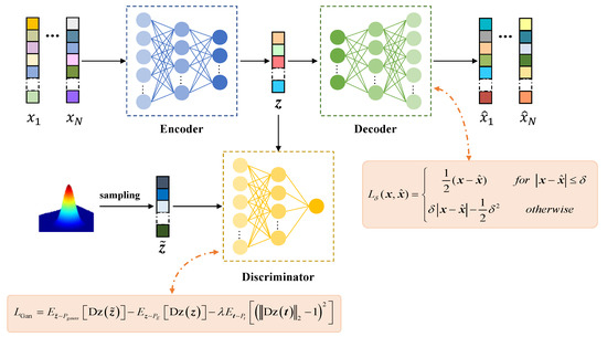 The specific structure of AAE in our proposed model is shown in Figure 4, and it is composed of an encoder E, a decoder De, and a feature discriminator Dz. The encoding–decoding process is considered the reconstruction of the original data . The reconstruction loss function is the Huber loss [63]: