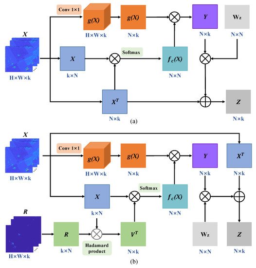 The original non-local network [67] flow chart is shown as Figure 5a, and assuming as the input and as the output, the original non-local network extracting global features is
